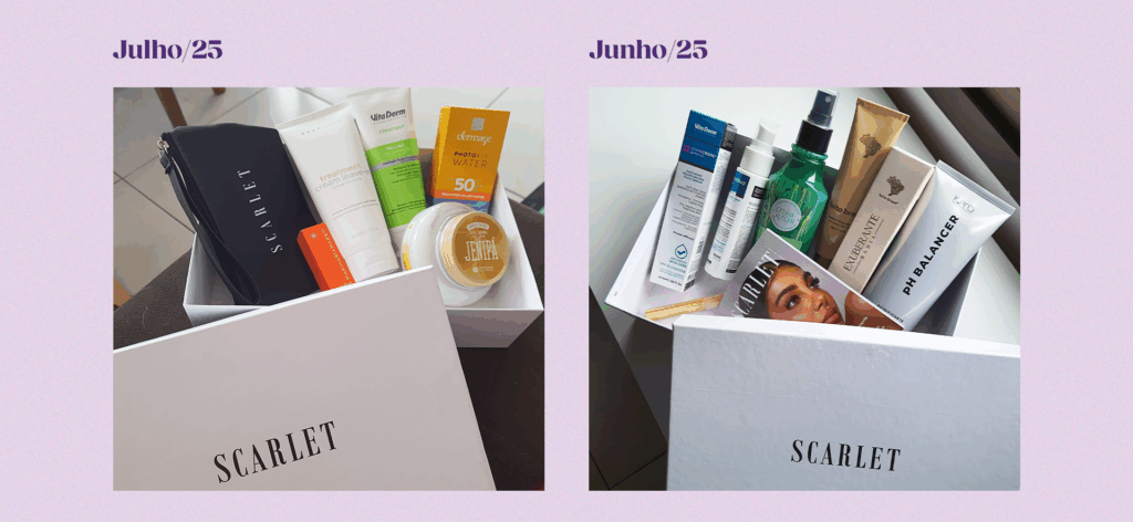 Durante essas pesquisas, foi que apareceu para mim a Box Scarlet, um box de assinatura de produtos premium, o que bate certinho com o meu momento. Acompanhei por alguns meses as caixinhas para ver se valeria a pena para mim, se vinham produtos variados e de marcar conceituadas e se o valor da assinatura valia pelo valor dos produtos recebidos.
